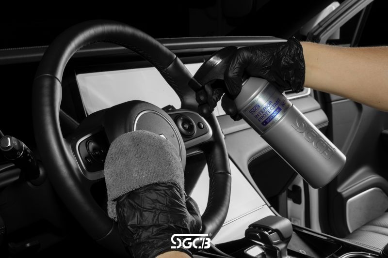 SGCB Interior Protectant (sgfb014/026/036) is a composite emulsion formula designed to restore and protect the interior of your vehicle. It's safe, non-greasy, and odorless after drying. Ideal for plastic, rubber, leather, and engine compartment plastic finishes. The product is easy to apply, simply spray and wipe, and offers long-term protection against aging and dust. Available in 4000ml, 500ml, and 120ml volumes.